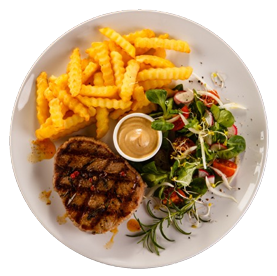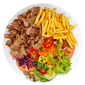 Servie avec salade, tomates, oignons + Frites.