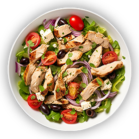 Salade verte, tomates, poulet, oeuf, maïs, olives + Pain offert sur demande.