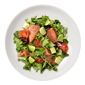 Salade verte, tomates, saumon fumé, avocat, olives + Pain offert sur demande.