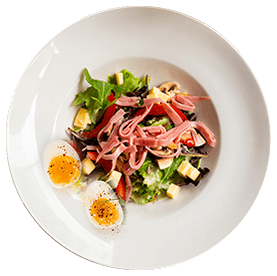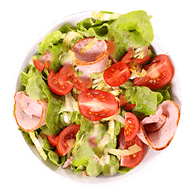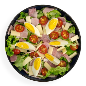 Salade verte, tomates, jambon, maïs, mozzarella, cornichons, oeuf + Pain offert sur demande.