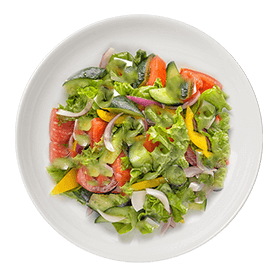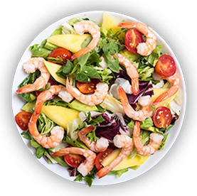 Salade verte, tomates, avocat, crevettes, maïs, olives + Pain offert sur demande.