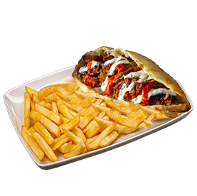 Pain au choix, viande grecque, salade, tomates, oignons + Frites.