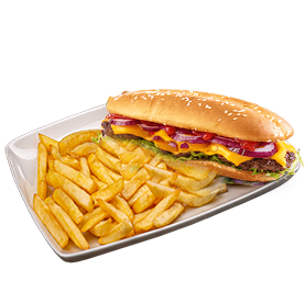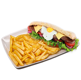 Pain au choix, 2 steaks, oeuf, cheddar, salade, tomates, oignons + Frites.