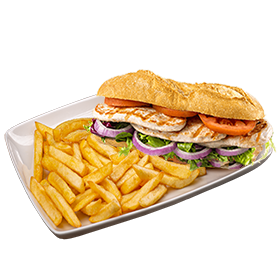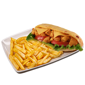 Pain au choix, poulet mariné curry, cheddar, salade, tomates, oignons + Frites.
